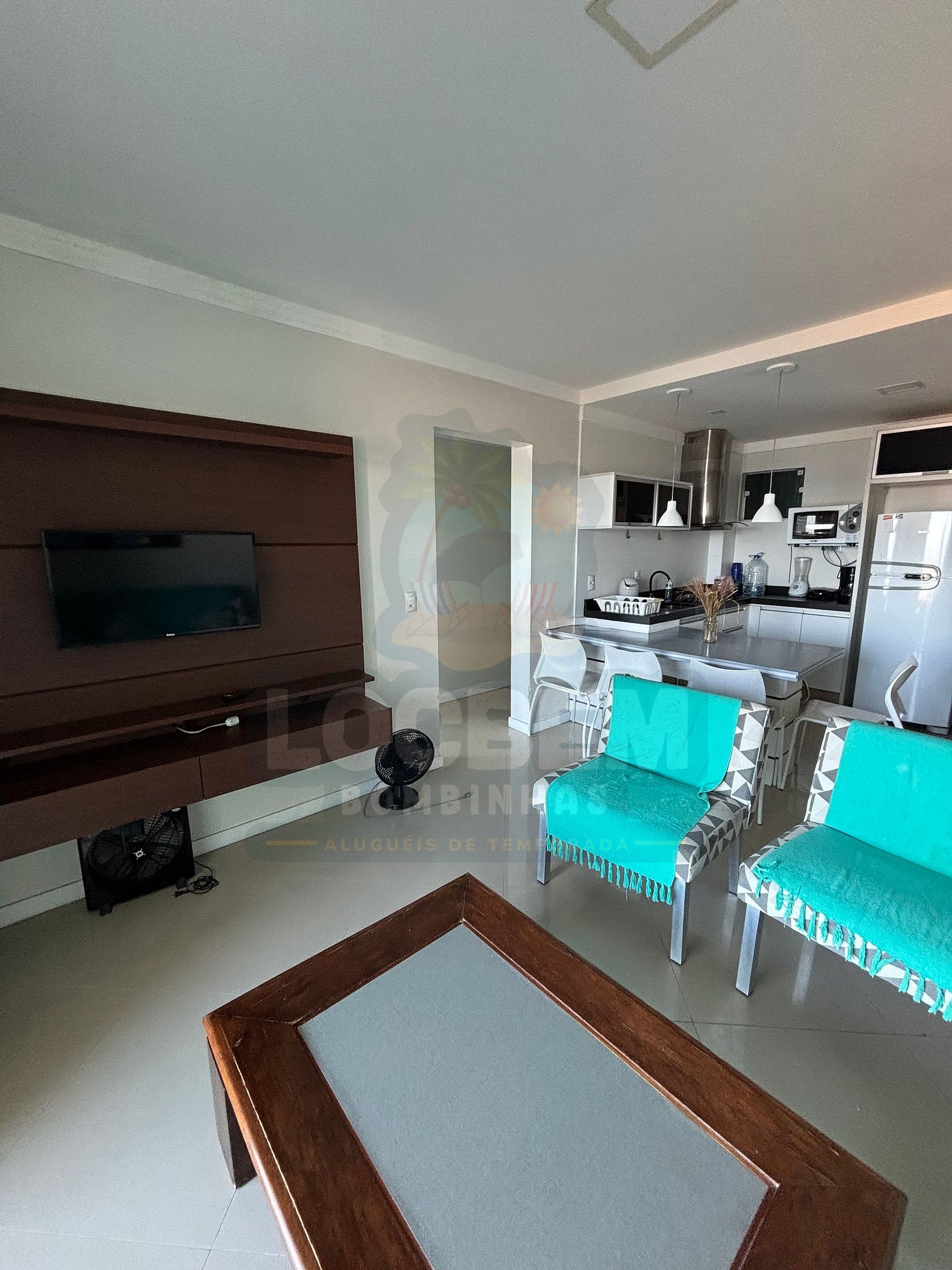 • Sala de estar integrada à cozinha, ambiente climatizado e com TV, sofá e mesa de jantar;