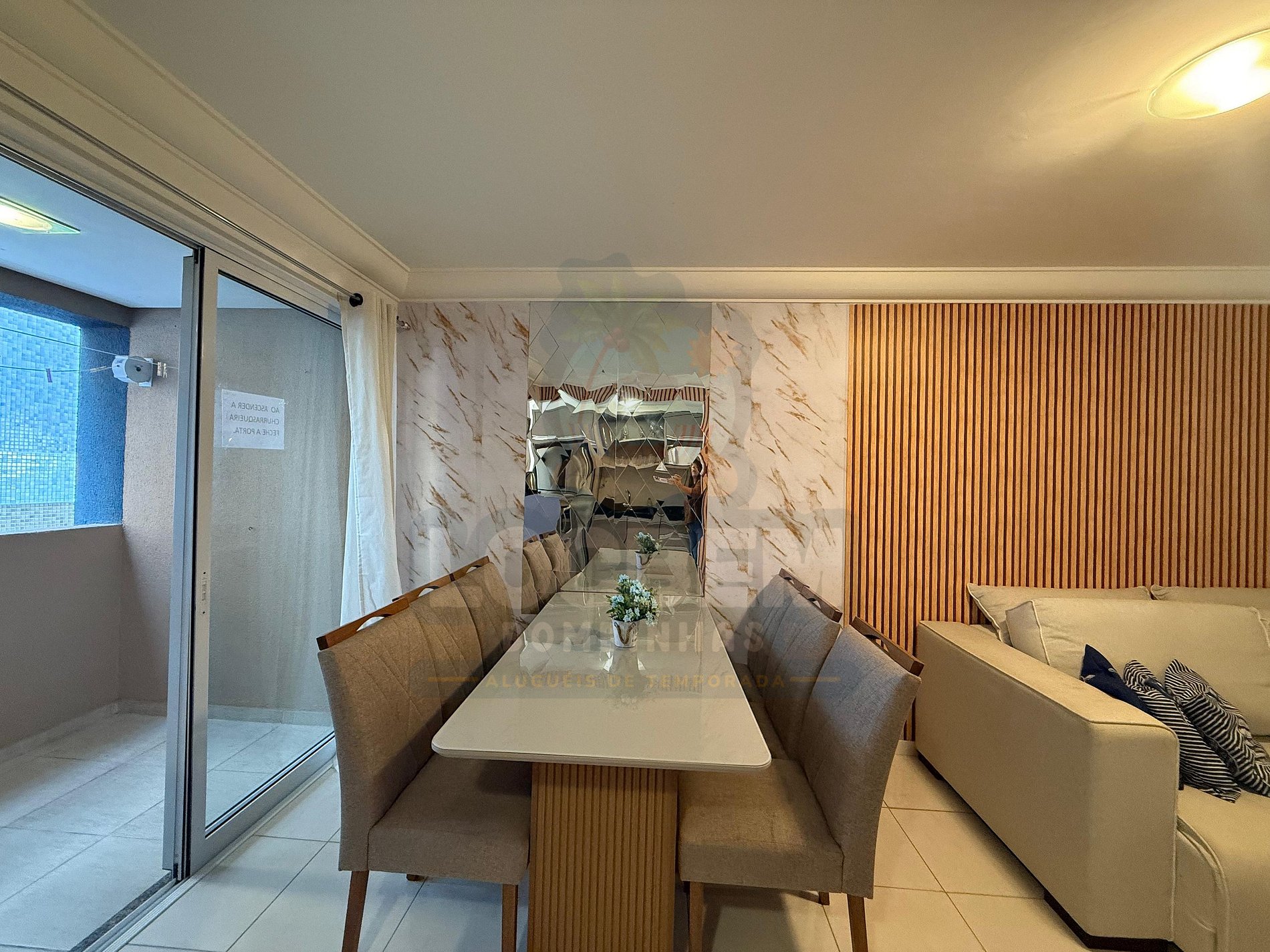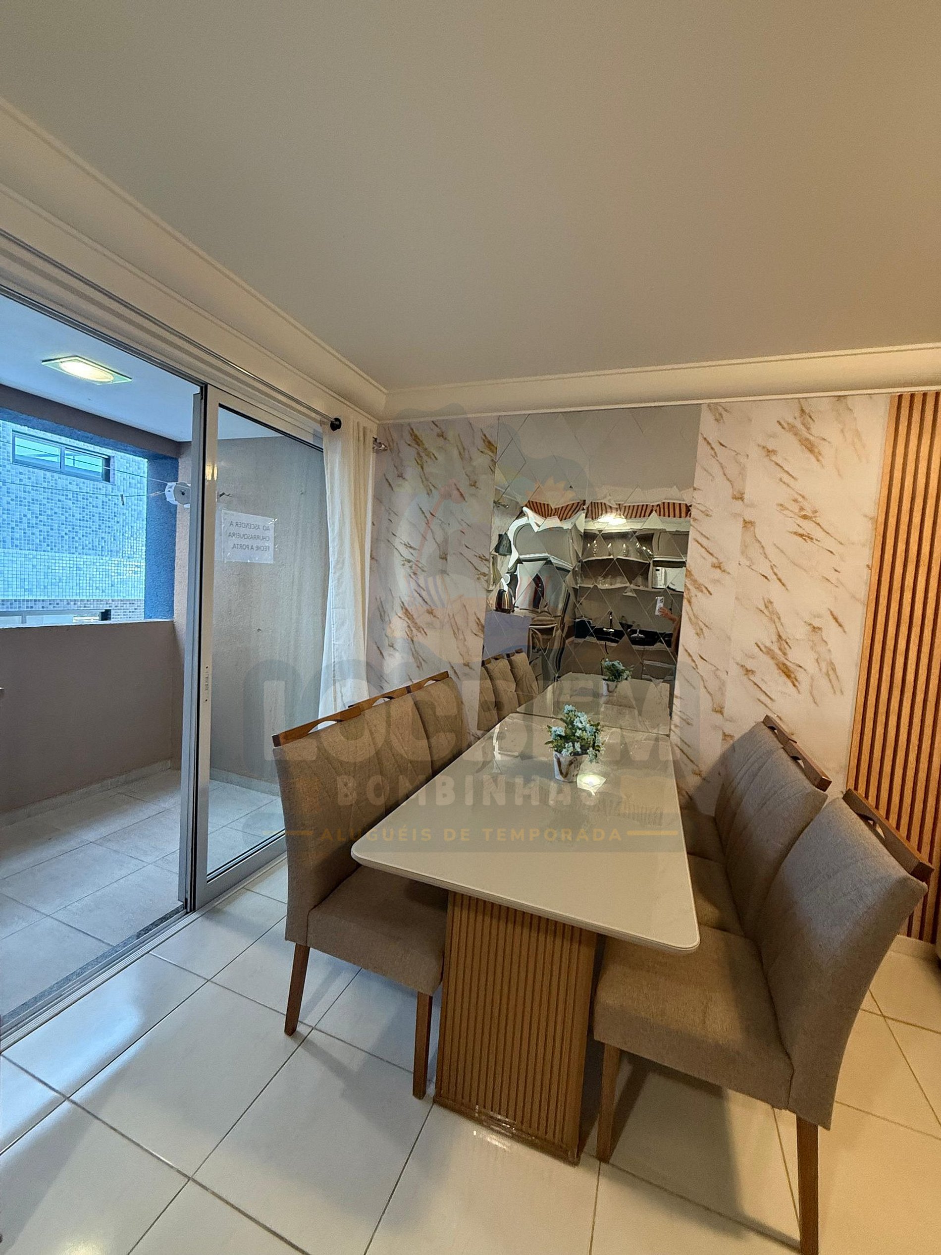 A sala e a cozinha são conjugadas, oferecendo um ambiente integrado, funcional e acolhedor, ideal para momentos em família ou entre amigos. Acomoda até seis pessoas, incluindo um sofá-cama na sala. A sacada possui churrasqueira, perfeita para desfrutar de refeições ao ar livre após um dia de praia.
